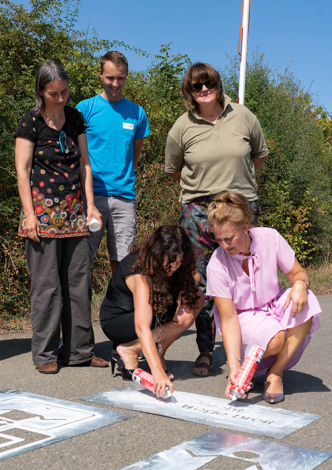 Um Begegnende zur gegenseitigen Rücksichtnahme zu ermutigen, werden spezielle Hinweismarkierungen auf geeigneten Wegen angebracht. Die Materialien (Schablonen und Farbe) stehen Mitgliedskommunen der AGFK und des Bauernverbandes kostenlos zur Verfügung. Auch darüber hinaus beraten wir gern zur Aktion. Kontakt