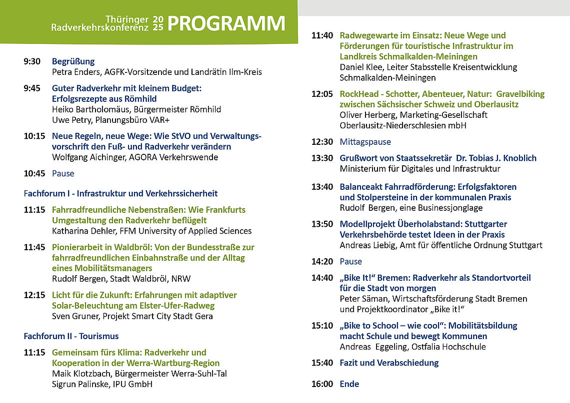 Im Rahmen der Thüringer Radverkehrskonferenz am 1. Oktober 2025 werden Foto- und Videoaufnahmen gemacht. Diese Aufnahmen können im Zusammenhang mit der Berichterstattung über die Veranstaltung sowie zur Öffentlichkeitsarbeit und Dokumentation in folgenden Medien verwendet werden:
